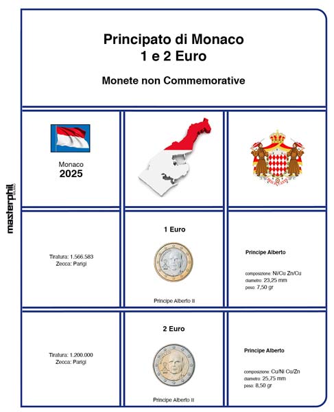 2025 pagina per monete 1 e 2 Euro Monaco non commemorativo